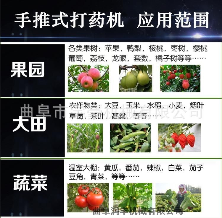 手推式汽油打药喷雾机结构特点:功率大,耗油少、压力强,雾化均匀,射程高/远;可同时多人作业、效率高、用药省、附着力强、降底防治成本;作简单,使用安全、维修方便。可进行雾化施药,直流清洗,水柱喷射,特别适合野外作业适用范围:城市园林绿化、公园广场消防、果园、大棚、农作物等病虫害防治。