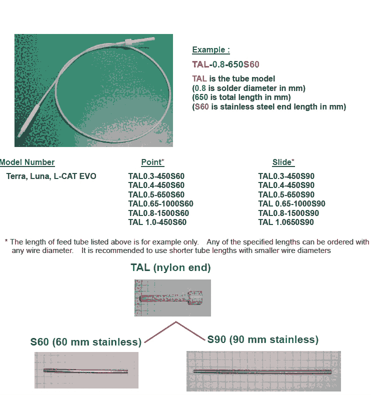 * The length of feed tube listed above is for example only. Any of the specified lengths can be ordered with any wire diameter. It is recommended to use shorter tube lengths with smaller wire diameters