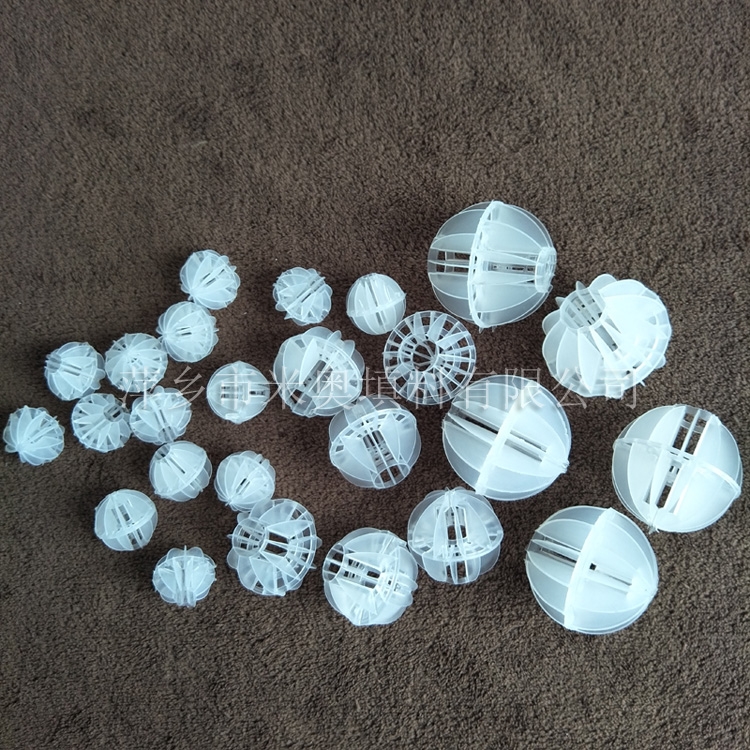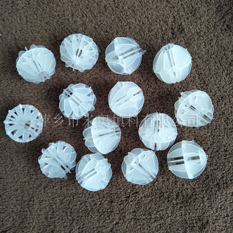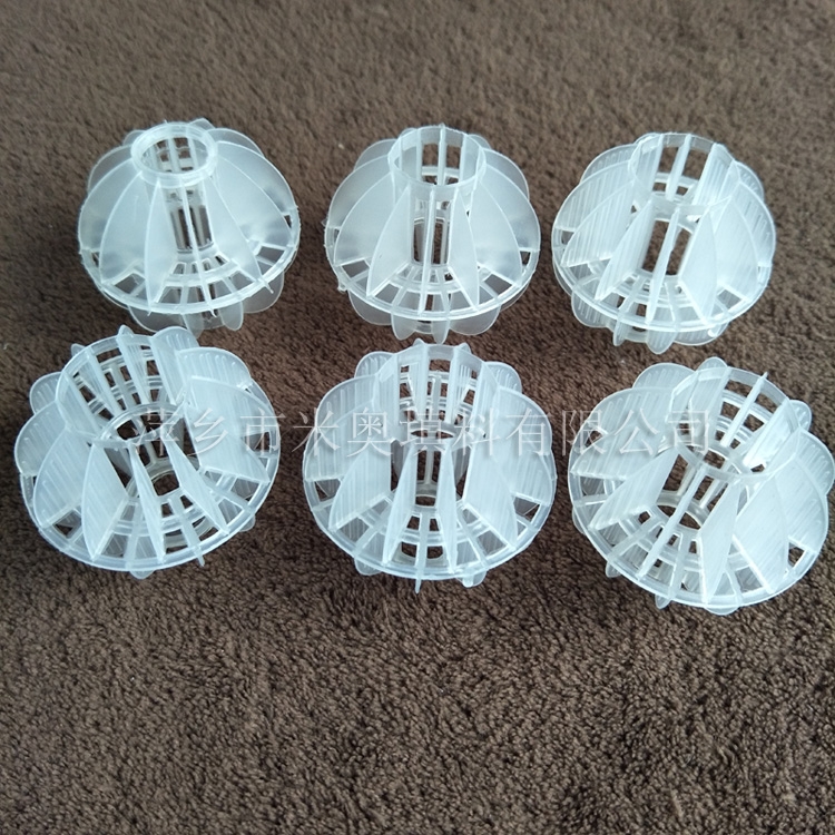 塑料多面空心球填料是水处理项目和废气处理常用到的一种填料,也是现在环保装置项目常见的一种填料,大多采用聚丙烯(PP)塑料制成。多面空心球填料,在球中部沿整个周长有一道加固环,环的上下各有十二片球瓣,上下球瓣互相交错,沿中心轴呈放射形布置。多面空心球填料具有表面积大,传质效率高,产品的球瓣与球瓣之间空间大,且重量轻、强度大、安装方便、叶片多,阻力小,耐高温,耐腐蚀,性能稳定,适用于中间水箱,二氧化碳脱氧塔,接触反应塔等装置。在全国电力、化学、化纤、电子、造纸、化肥生产、河水淡化,环保、三废处理等行业的水处理、脱碳、脱气、净化、脱碳酸及油水分离等处理装置中广泛使用。