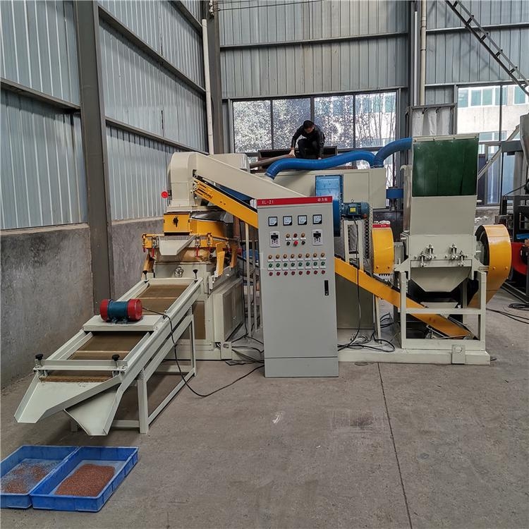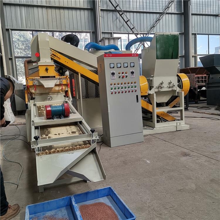 铜米机(又名废旧电线电缆回收设备)用于对废旧铜线粉碎将铜和塑料分离的机械。由于分离出来后的铜像米粒一样。因此称为铜米机,铜米机属于环保机械的一种。 适用范围及功能:是针对各种汽车电路线,摩托车线路.电瓶车线.电视机.洗衣机.电冰箱.空调等家用电器线.通讯线.电脑线等各种剥线机不宜加工的各种废线。机器整体构造,客户接电就可生产。全自动粉碎.上料.吸尘.分离。只需一人投料即可生产,先进的集尘装置,干式分离,分离出来的成品可以直接销售。全自动干式铜米机是国内先进的杂线分离设备。
