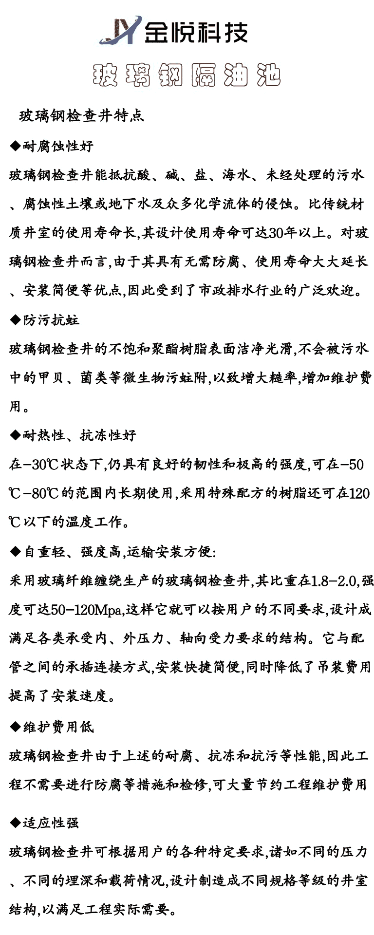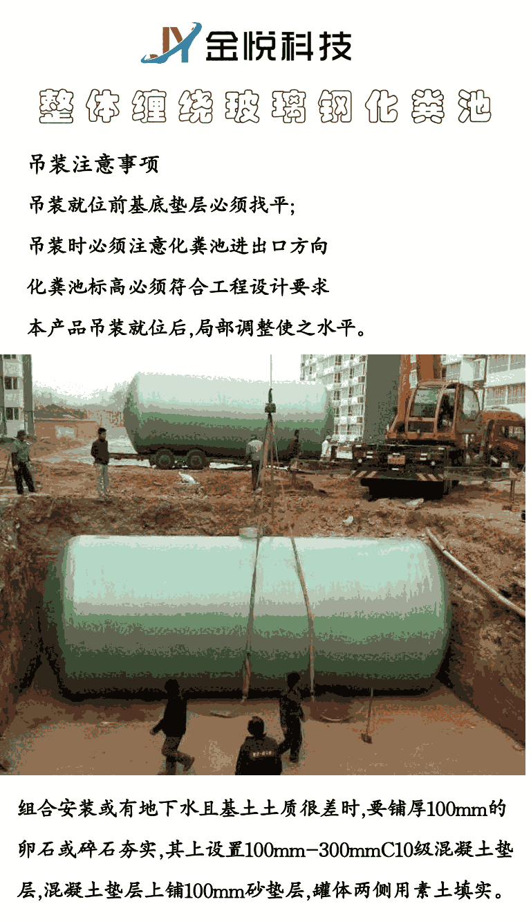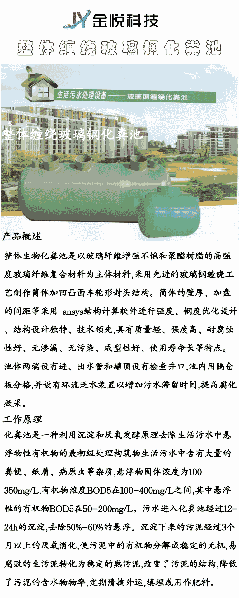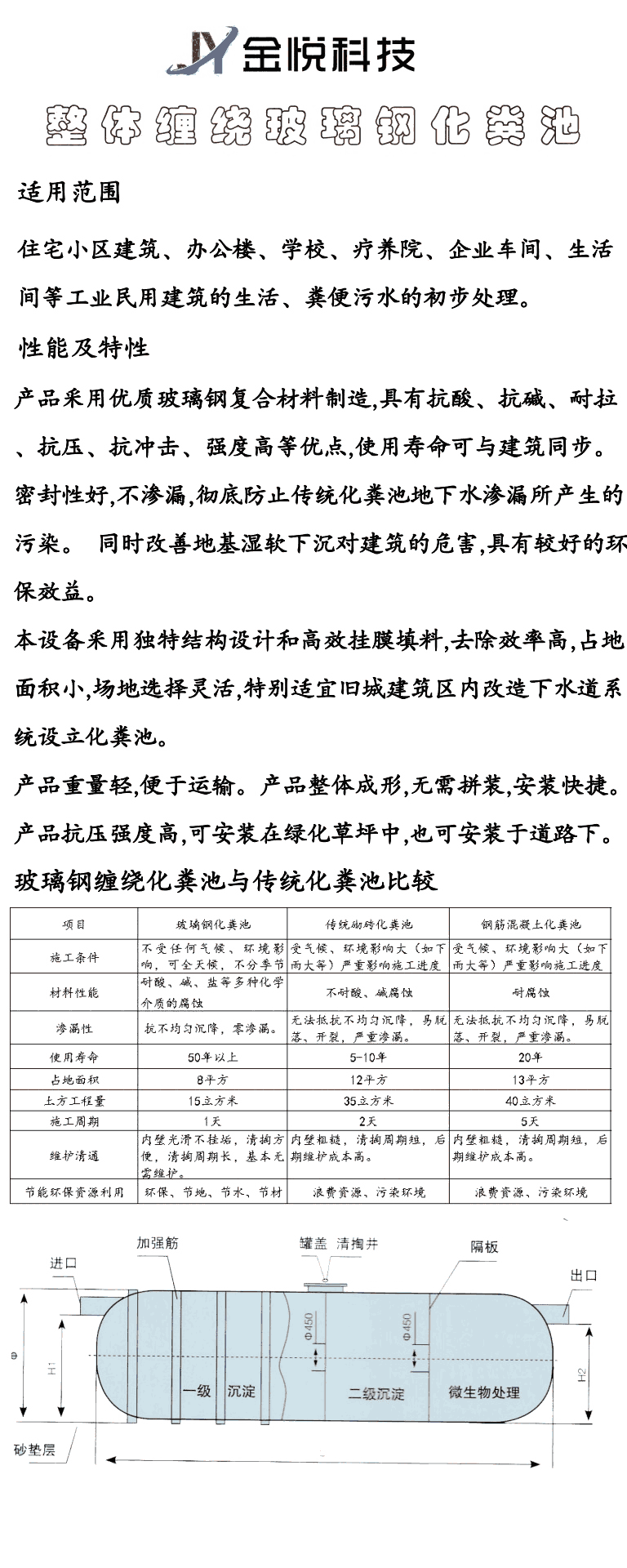 整体化粪池是以玻璃纤维增强不饱和聚酯树脂的高强度玻璃纤维复合材料为主体材料,采用先进的玻璃钢缠绕工艺制作筒体加凹凸面车轮形封头结构。简体的壁厚、加盘的间距等采用 ansys结构计算软件进行强度、钢度优化设计、结构设计独特、技术领先,具有质量轻、强度高、耐腐蚀性好、无渗漏、无污染、成型性好、使用寿命长等特点。池体两端设有进、出水管和罐顶设有检查井口,池内用隔仓板分格,并设有环流泛水装置以增加污水滞留时间,提高腐化效果。