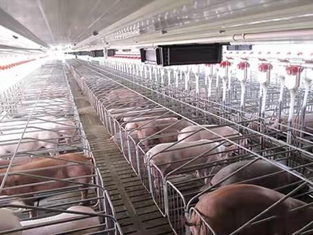 猪场自动化料线原理: 在三相交流电动机的带动下,绞龙将饲料从料塔传送到猪舍。料线管道从猪只采食的食槽上面经过,在每一个食槽位置,留有一个下料口。饲料在绞龙的带动下,自动的流入食槽中。