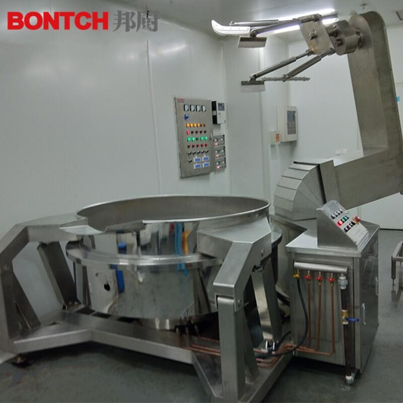 邦厨批发供应不锈钢高粘度火锅底料油料炒锅多爪行星搅拌炒锅设备多爪搅拌炒锅体为一次冲压成型的半球形不锈钢锅体,采用蒸汽、液化气、天然气等加热形式,搅拌方式采用特殊的倾斜式传动,使用的行星式搅拌器与锅体充分接触,实现传动公转与自转的不整数传动比,使锅内无搅拌死角。使用先进的传动与密封结构,使传动部分与锅内洁净、卫生。采用变频调速动力,运行更平稳。另本机采用液压升降,翻锅运料,免拆装搅拌器,节省人力,降低劳动强度,是性能优良的食品加工设备。主要用于比如带肉的酱料、粘稠的火锅底料、各种需要翻炒馅料、阿胶制品、熬糖等。