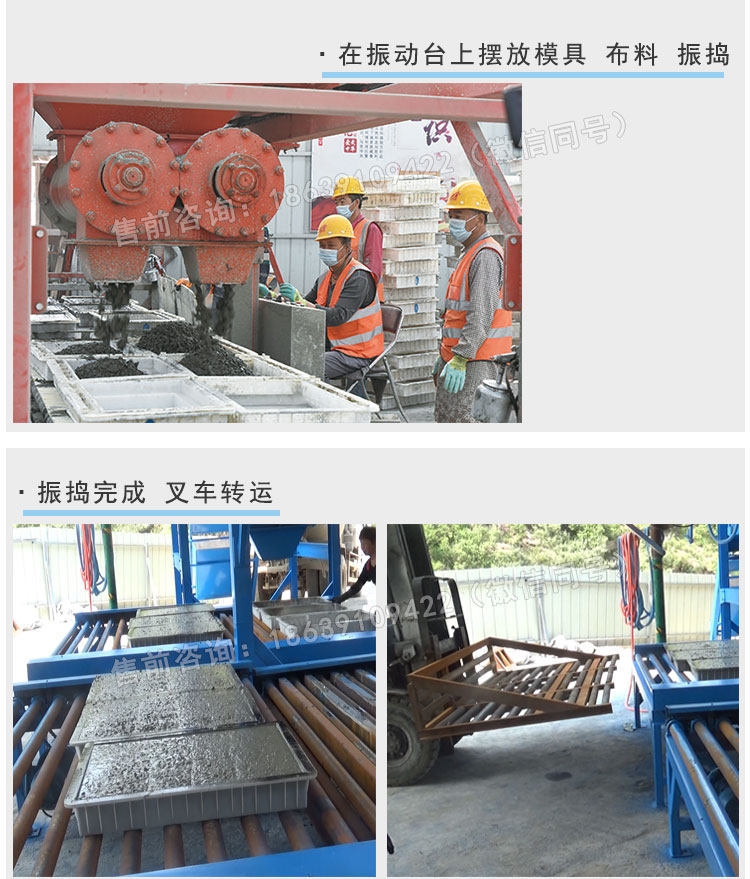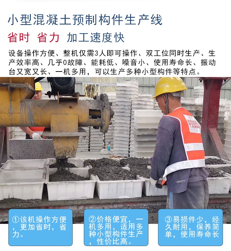 小型预制构件生产线 水沟盖板预制生产线 自动上料预制构件生产线一机多用,能够生产各种规格的水泥、混凝土预制块, 由两个振动台,可以同时不间断生产。 操作简单,易上手,一学就会。