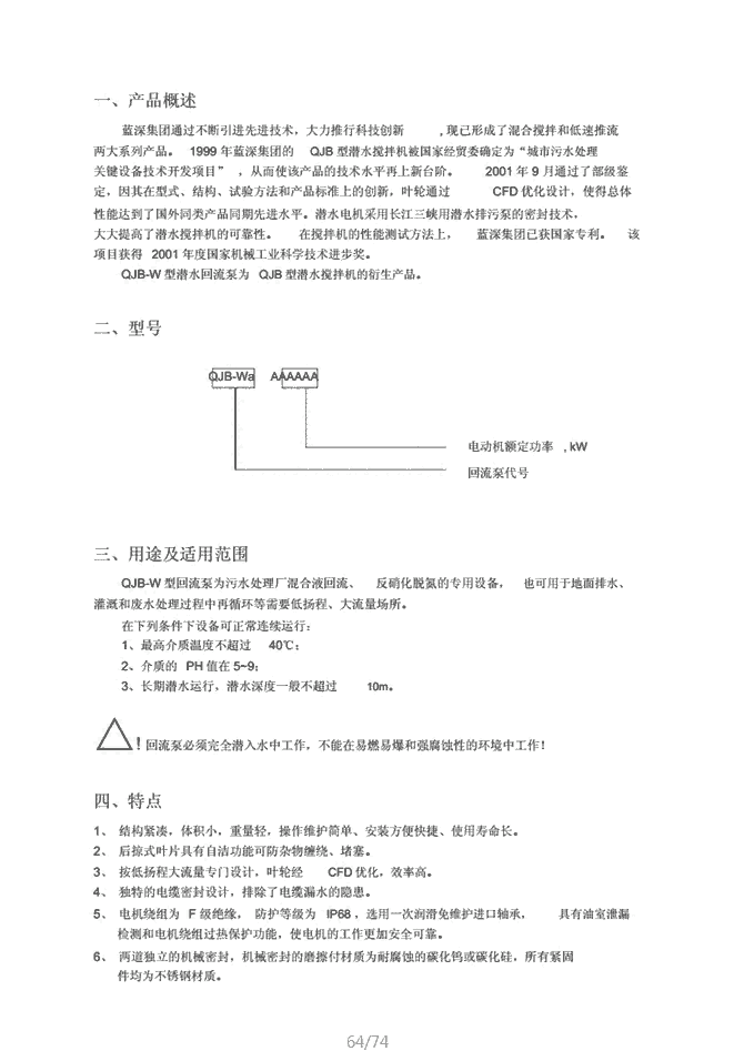 江苏杜安环保QJB-W4穿墙回流泵及其附件成套设备的总的要求,不包括所有可能随所提供设备的不同而有所变化的细节。但不管本规范是否提及,本规范包括设备有效运行所需的所有材料、设备和附件的供货、工厂试验、运输、交货、安装和调试。