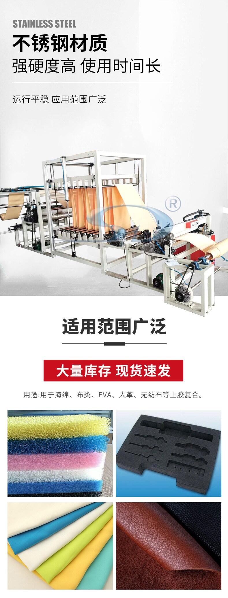 This machine uses hot melt glue to spray and adhere to the surface of the material. The two layers of materials are pressed and bonded by the rear pressure roller. Common bonding materials include pearl cotton, non-woven fabric, glass fiber cloth, woven cloth, lining cloth, lamb velvet, suede, leather, sponge, etc. Fastness is required for some materials.