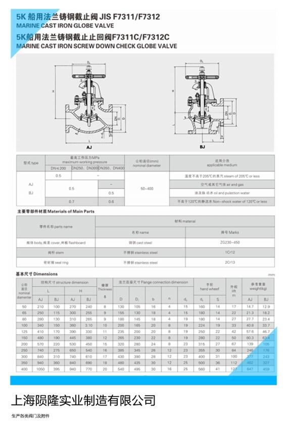船用法兰铸钢截止阀GB/T584-99船用法兰铸钢截止止回阀GB/T585-99 ,船用法兰铸铁截止阀GB/T590-93船用法兰铸铁截止止回阀GB/T591-93,船用法兰青铜截止阀GB/T597-93船用法兰青铜截止止回阀GB/T588-93型式;A型AS型B型BS型,公称压力;PN0.6 1.0 1.6 2.5 4.0 6.4.适用介质;海水,淡水,滑油,温度不高于300℃的水蒸汽,阀体;铸钢/球墨铸铁/青铜,阀杆;不锈钢/铝青铜,阀盘;不锈钢/锡青铜,公称通径;DN15-DN500.
