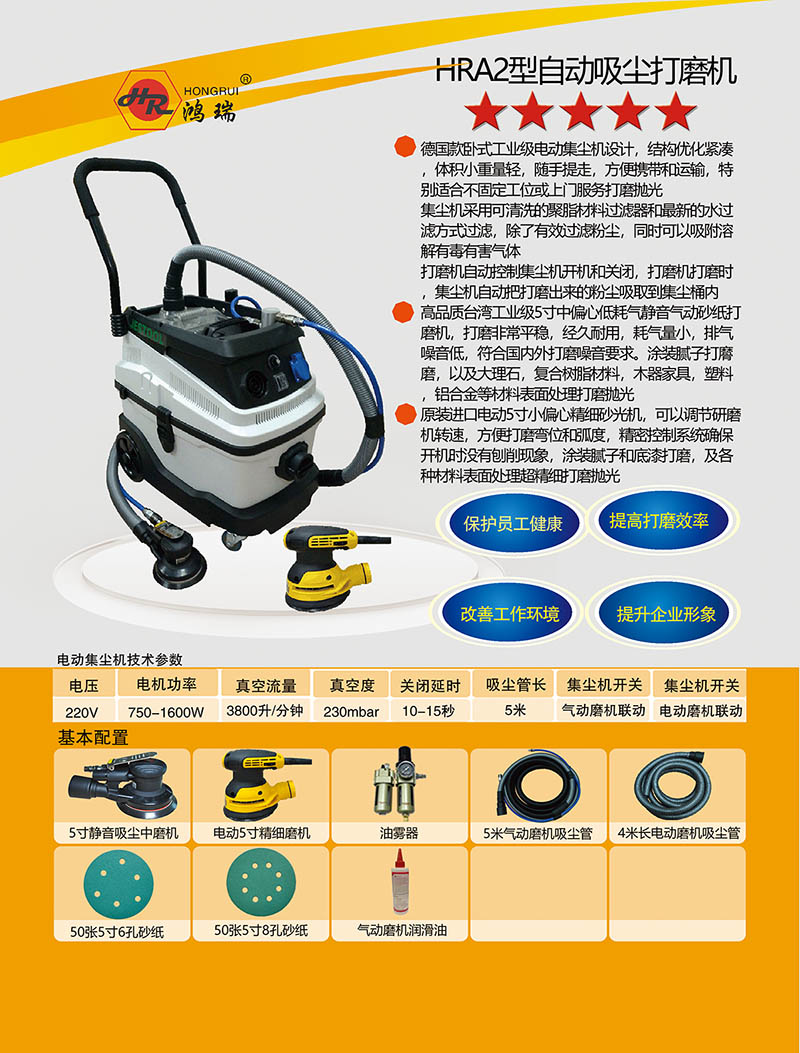 5、台湾鸿瑞高品质工业级气动低耗气低噪音5寸砂纸打磨抛光机,打磨耗气小、打磨噪音低,符合国内和欧盟打磨噪音要求。粘贴400目以下砂纸打磨抛光,玻璃钢、环氧树脂、碳纤维等复合材料、铝材、大理石、木制品、橡塑制品等表面处理打磨抛光,涂装除漆、和腻子打磨。