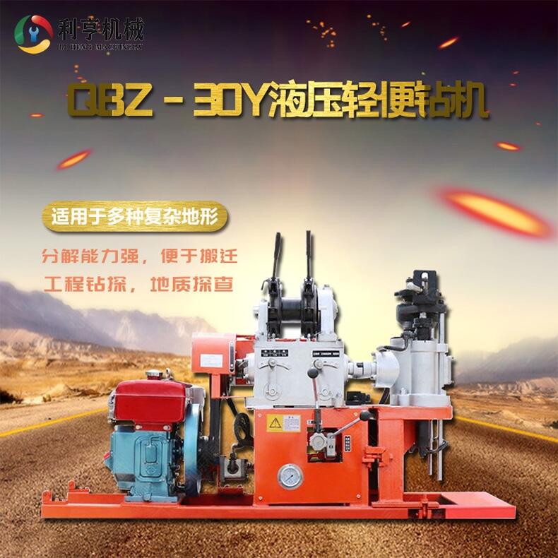QBZ-30Y型液压轻便钻机是一款小型轻便油压给进的钻探机械,主要用于普查勘探、地球物理勘探、道路和建筑以及打爆孔等钻进工程,浅层石油、天然气及地下水钻探,并可用于堤坝注浆和坑道通风、排水等工程钻探。QBZ-30Y型液压轻便钻机额定钻孔深度30米,开孔直径允许为89mm,终孔直径为75mm。