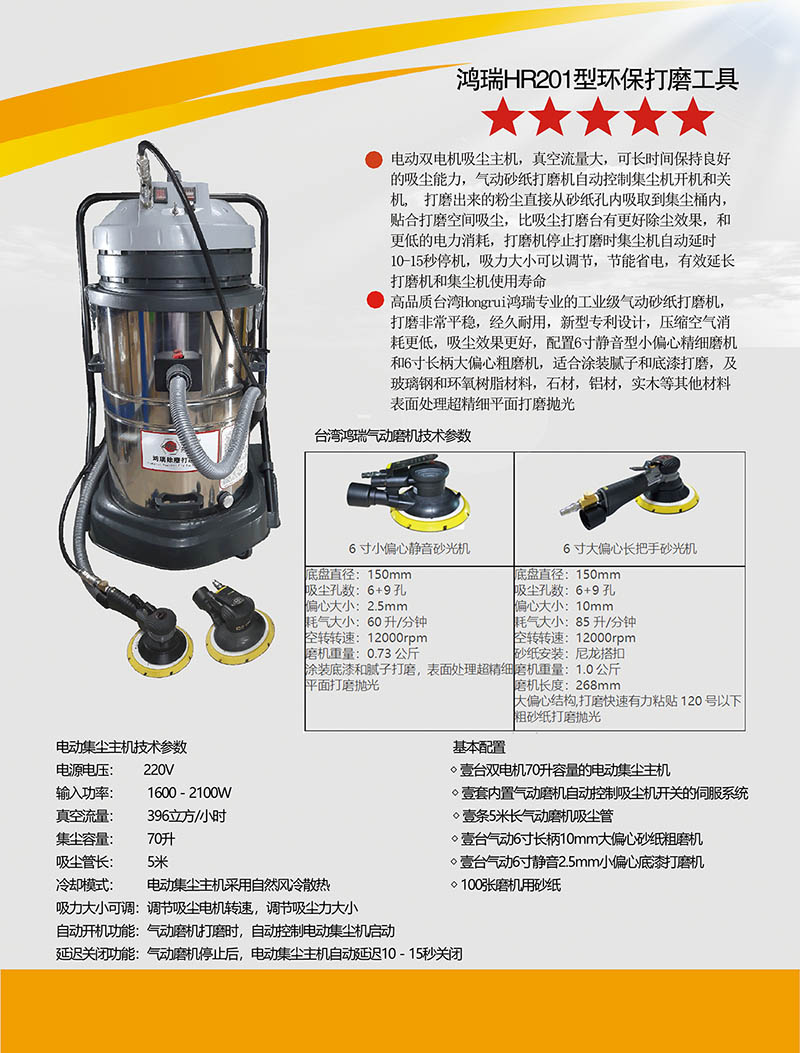 3、台湾鸿瑞高品质工业级气动磨机,可在工厂打磨线长时间打磨,内螺纹吸尘口结构,吸尘管直接旋进磨机吸尘口不会松脱。6寸长柄10mm大偏心砂纸打磨抛光机,打磨快速高效,长手柄可以双手操作打磨,长时间打磨不容易疲劳。粘贴120号以下粗砂纸玻璃钢、环氧树脂、碳纤维等复合材料、铝材、大理石、木制品、橡塑制品、金属氧化层等表面处理快速打磨抛光,涂装除漆、和腻子快速打磨;6寸低耗气低噪音2.5mm小偏心砂纸精细打磨抛光机,打磨时耗气少、噪音低,符合国内和欧盟打磨噪音要求,粘贴400目以上细砂纸涂装中途底漆打磨,表面处理超精细打磨抛光