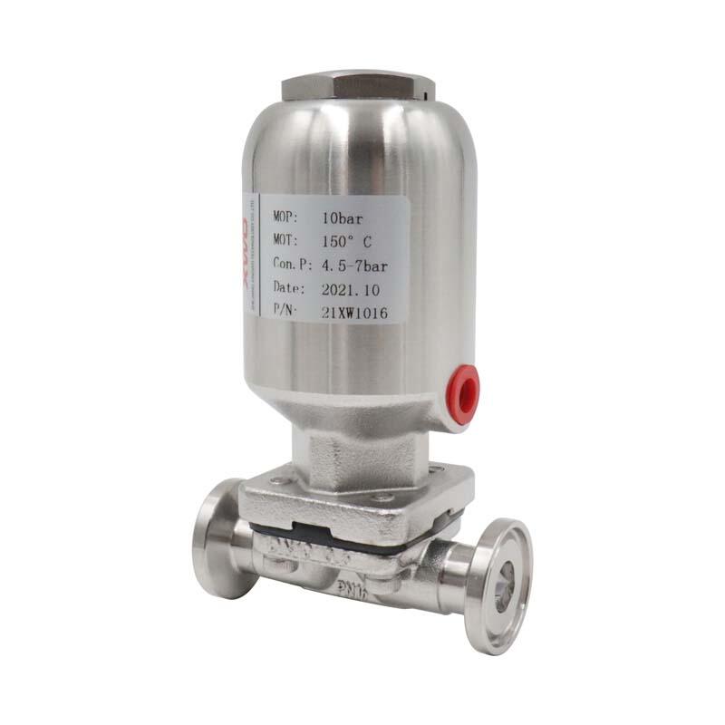卫生级气动隔膜阀既通过一个气动头进行遥控操作,也可以通过一个手柄进行手动操作。适用于管道流体的控制和开/关的任务。广泛应用于卫生级的酿酒,乳制品,饮料等食品工业中以及无菌工况的制药领域。推荐30角度安装,有利于阀门清洗后完全排泄,不易造成液体滞留阀门内部。
