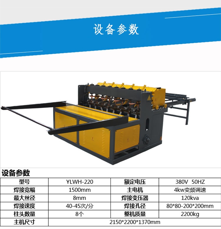 YLWH220型钢筋网排焊机 支护网焊机 带肋钢筋焊网机 1、钢筋施工走焊接网道路是钢筋工业发展的潮流。 2、钢筋网这种新型配筋形式,特别适用于大面积混凝土工程。 3、我国冷拔带肋钢筋、热轧III级钢筋广泛、快速的推广应用为焊接网发展提供良好的基础。焊接网产品及使用规程的正式施行,对于产品、加速推广应用起到了积极作用。 4、我国市场对钢筋网需求潜力很大。 5、钢筋网在审美上令人喜爱。 6、我国是钢材大国。 7、钢筋网在国内的发展已经具备了软、硬条件。