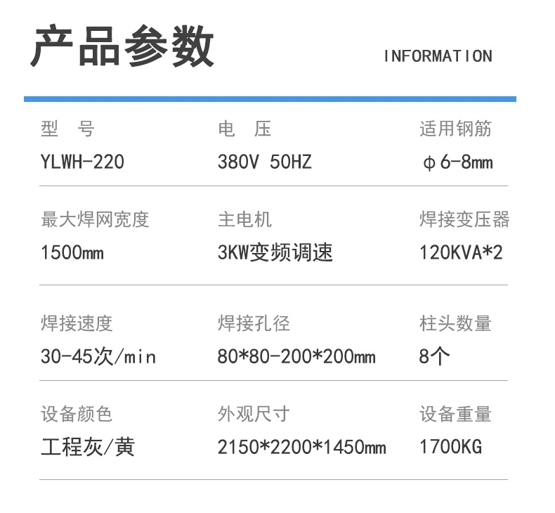 异型网片焊网机 一般用于专业生产工艺网,异型网片等。 机型特点: 1,先进电脑及“焊接专家”程式 利用先进微电脑精密调较可分别设定焊接中有关参数,可选择在焊接多次放电,控制焊接,单/多脉冲或缓上形式放电,以过大焊接电流对焊点做成之冲击,把焊接火花及产生之影响到少。 2,数位显示及记忆 焊接参数调较以LED管显示资料及状态,以数码储存在E。EPROM记忆内资料不会偏差,保存。 3,双级气业 焊接以高低两级压力分别加压,防止焊头突然下冲而压坏工件,然后加上较高压力进行焊接,这装置令焊头以低压力操作,以较快速度下降而增进效率,而把对工作的冲击到小。 4,电源及波动自动补偿 内置微电脑扫描电网及变化,如出现电压,波动不稳或供电有偏差,自动补偿调节。 建筑钢丝网排焊机采用电力电子同步控制技术,焊接时间与分控焊接均由数字化集成化电路组成,控制精度高,性能,焊点牢固,无烧痕。焊接速度快,而操作简单易学。纬线配置了精密截纬装置和轴向定位装置,确保了纬丝长度一致且边缘整齐,无须裁边。拉网采用了弹性拉杆与网格定位装置,使网格微调容易,网格尺寸精度高,焊丝孔径可在范围内任意。