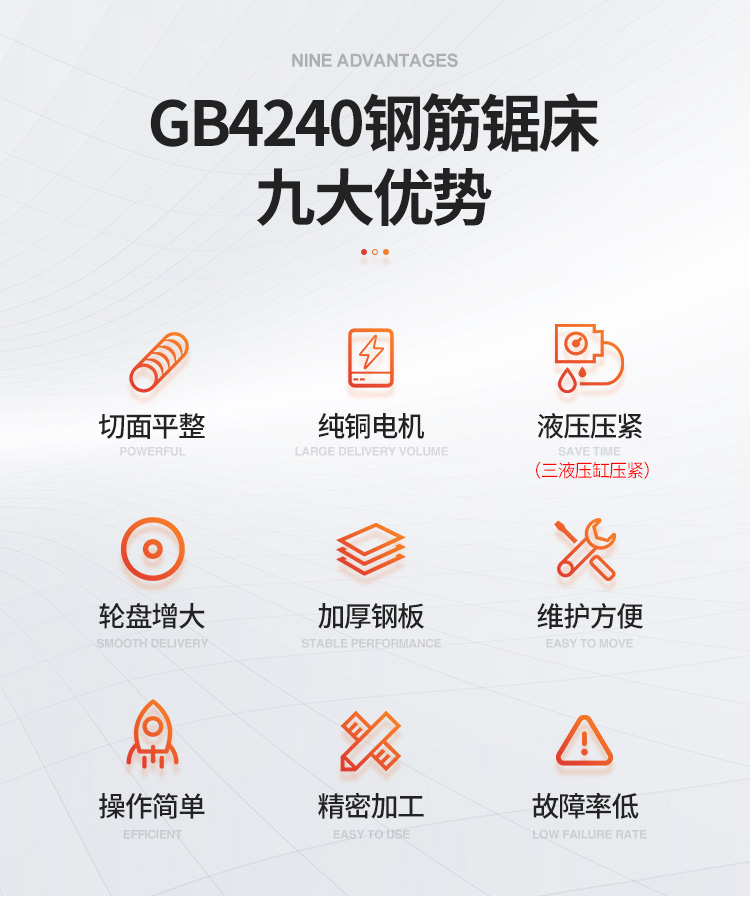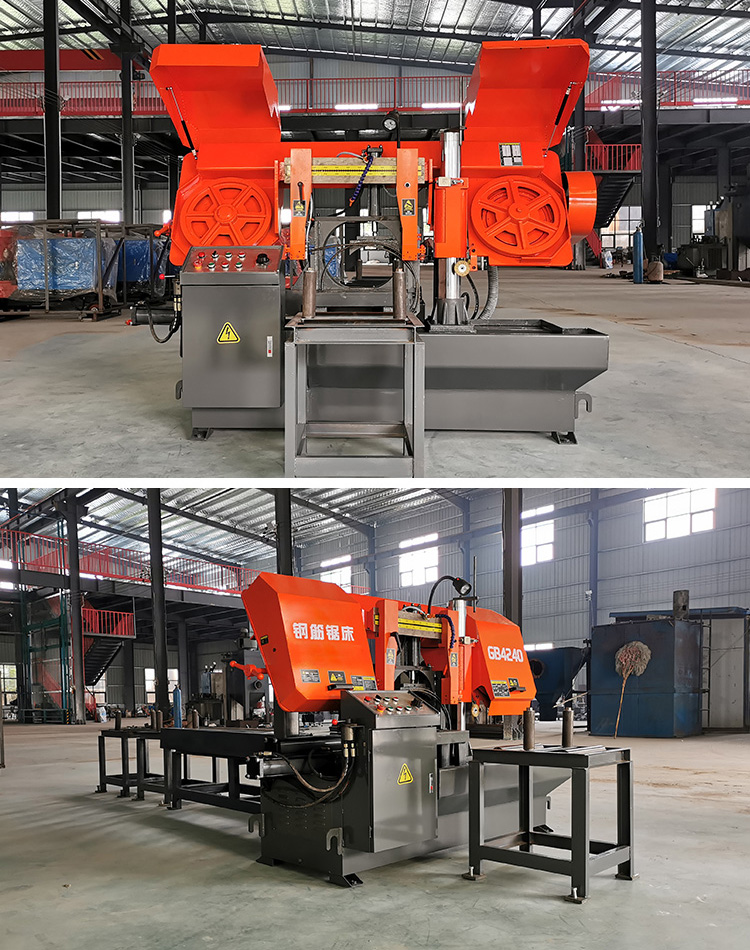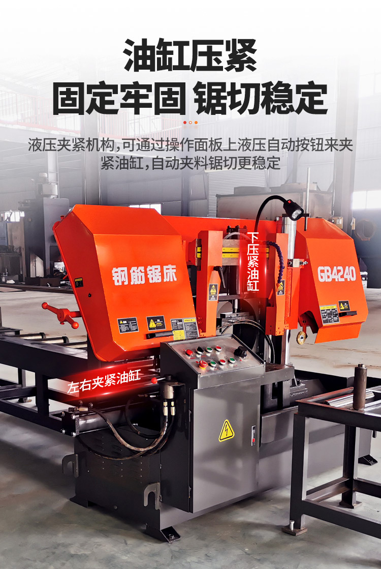 1.本机采用技术,双立柱结合,保证导向精度,锯削可靠。 2.虎钳,锯切下的工件不会松动,避免压损锯带,保证锯带。 3.钢刷清屑,有效清理锯齿间铁屑,锯带使用寿命。 4.锯床传动机构精密平衡校正,振动确保锯带不易断齿,拉齿。 金属切割带锯床 电动液压钢筋专用带锯床 全自动圆钢切割锯床