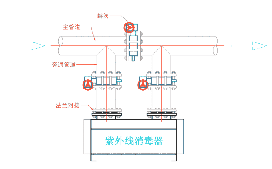 5. 无论选用一台或多台紫外线饮用水消毒器并联,均应安装旁通管路和截止阀,以便于紫外线饮用水消毒器整体维修拆装。
