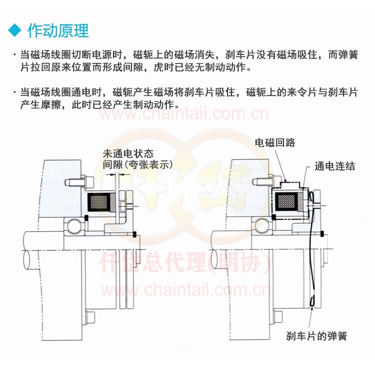 1、当磁场线圈通电时,磁轭产生磁场将电枢板吸住,磁轭上的来令片与电枢板产生摩擦,此时已经产生制动动作。