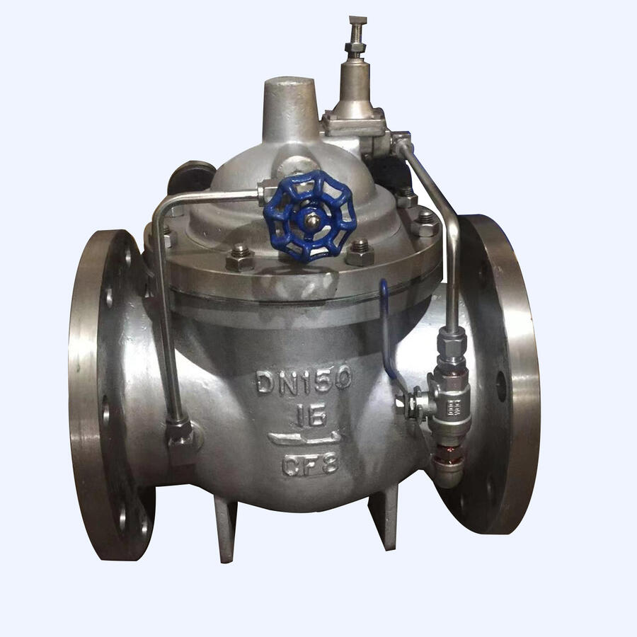当阀门从进口端给水时,水流过针阀进入主阀控制室,出口压力通过导阀作用到导阀上。当出口压力高于导阀弹簧设定值时,导阀关闭。控制室停止排水。此时主阀压力控制室内,压力升高并关闭主阀、出口压力不在升高。