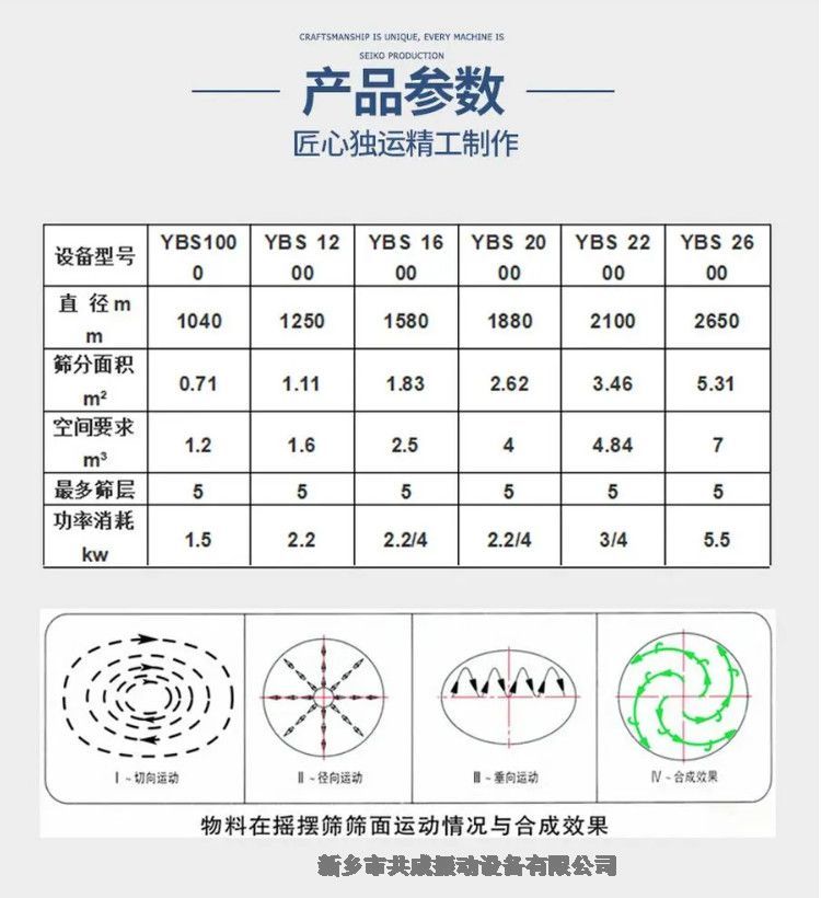 1. 筛分直径:圆形摇摆筛的筛分直径可根据用户需求定制,常见的有600mm、800mm、1000mm和1200mm等尺寸可供选择。