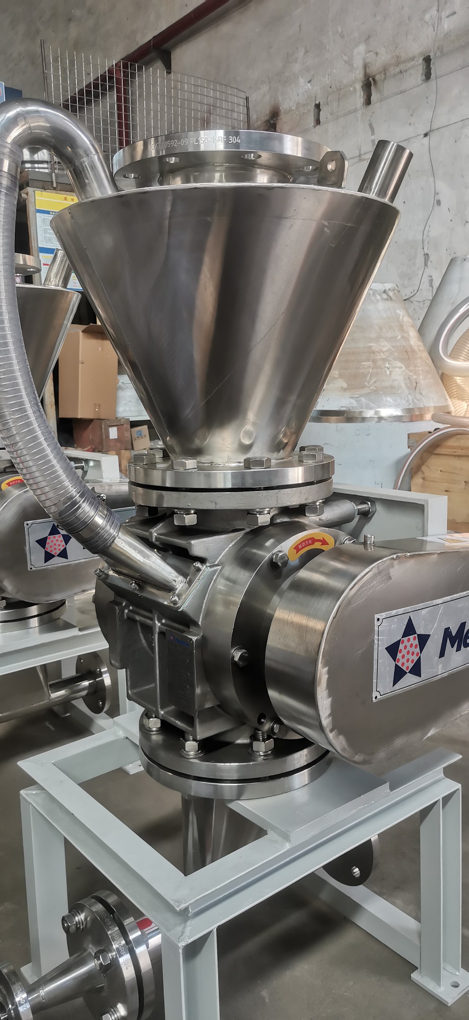 物料从上部料斗下落到星形叶片之间,然后随叶片旋转至旋转阀下部,凭借重力从出料口卸出。