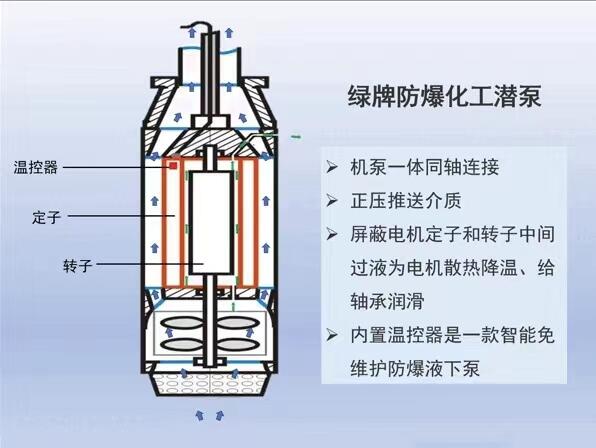 绿牌防爆潜泵是将电动机和离心泵一起浸入罐底部,电动机与离心泵紧紧相连,带动叶轮给液体增压,将与液体推送至目标贮液器,实现付液或零位罐向立罐输送液体。由于电机和泵都在罐内,无需使用细长轴,从根本避免了高维护率的问题,不仅节省了材料费、人工费,更不会耽误生产。从节电的角度来讲,一般可至少节省50%左右的能耗。而且运行时噪音极低。