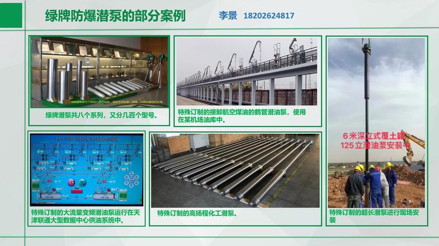 绿牌潜泵可满足50米60米70米扬程,每小时输送50立/70立/90立介质。产品分为八个系列:大流量系列、化工系列、高扬程系列、鹤管系列、标准系列(加油站用)、变频系列、自适应系列、超大流量系列(100-500立方米/每小时)等数百种型号,可以满足用户不同的流量扬程需求。