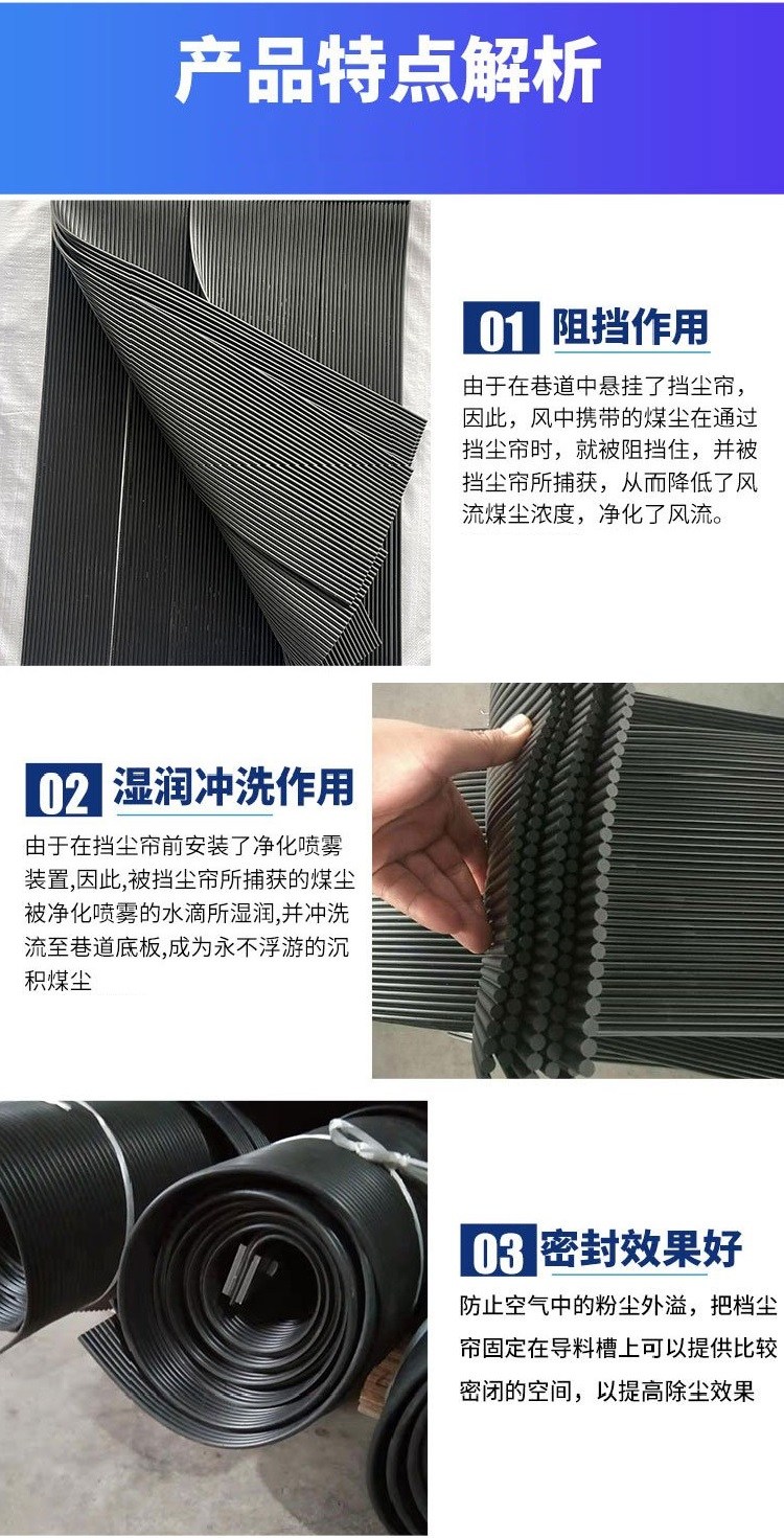 产品使用→: 挡尘帘是对巷道掘进或工作面回采期间产生的粉尘进行阻断的有效工具。它的安装要与巷道形状相匹配。挡尘帘安装要求封闭巷道全断面,喷雾与挡尘帘之间有一定的间隔,达到更好的防尘环保的作用。