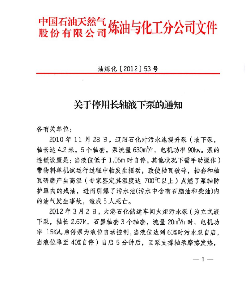 中石油因长轴液下泵事故频发 而发布关于长轴液下泵停用的通知