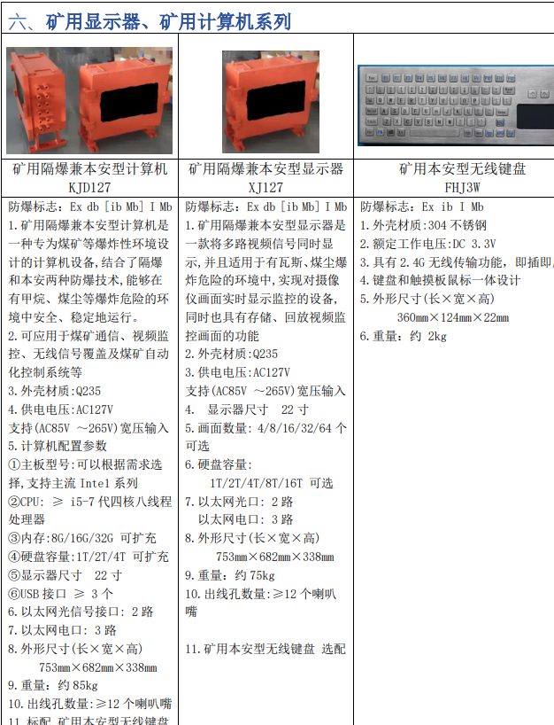 本监视器按《XJ127矿用隔爆兼本安型显示器企业标准》设计制造,用于煤矿井下需要不间断监控的场所。本监视器是煤矿井下安全监控系统中对主要生产环节、重要设备及关键岗位进行实时图像监视的关键设备。本监视器结构紧凑,体积适中,防爆,本安,抗震,防潮,适合于煤矿井下使用。