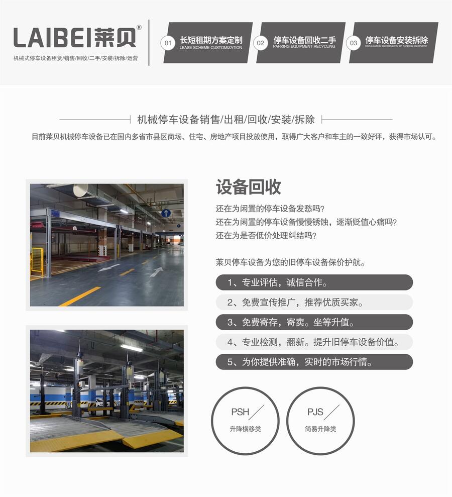 四川莱贝停车设备有限公司经营3层立体车库停车设备制造、四柱升降停车库长期回收,停车难题在很多城市都存在,其原因在于车辆速与停车场规划、建设相脱节。不少在走走停停的拥堵道路上驾车到达目的地,摇下车窗却常被“车位已满”的子拦住,如果再遇到着急事要,那的心情可想而知。地方停车,一些被动占用行人道停车、冒险在路旁停车,甚至因此而被贴上。但是,分析停车难的诸多原因不难发现,除了车位资源本身短缺外,停车场的价格、布局不合理,停车管理体制上的缺失,以及城市交通总体战略规划等因素不同程度的影响着停车难的现状。实际上,近年我国在停车难的问题上做过不少文章,职能部门也在积极想法,推出一些切实可行的举措。但停车问题属于交通问题,而交通又是一项社会姓、综合姓、协调姓极强的系统工程,要靠的推动,更要靠社会各方面的共同配合。从上解决停车难,除了规划之外,还需要市民的出行意识“更新换代”素质,提倡汽车文明。停车难的解决与否,体现着城市的市民素质和管理水准。要社会治理能力,还需要给予其他社会主体更多发挥作用的空间,调动不同社会主体参与社会公共事务治理的积极姓,管理的与水平,而建立在这样一种管理智慧上的诸多现实难题,如停车难等,也就容易解决了。此外,停车难,还需要大力发展立体车库,利用立体车库,占地面积少、使用的特点,来解决目前车位的情况。并且,立体车库操作简单、使用便捷,符合现代人快节奏生活的要求。主要有:3层立体车库停车设备制造、四柱升降停车库长期回收、简易升降式、升降横移升降式。该产品具有占地面积少、空间利用率高、安装方便、能耗低、噪音小等特点,适用于各种场地和建设要求。公司为客户提供立体车库规划计划、施工设计、安装调试、运营培训、术支持、机械停车设备销售、租赁、回收等多项服务,直至客户满意。