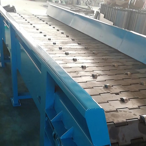 链板输送机是由一系列支承在滚子链上相互搭接的金属链板形成一个连续移动的工作面来载运散装固体物料的输送设备。链板输送机有水平型、倾斜型、水平倾斜型三种机型,其工作原理基本相同,物料的移动是靠链板载运而形成。链板板输送机机构简单、适用范围广、输送能力强、运行阻力小、安装维修方便、使用寿命长。它不但能水平输送,也能倾斜输送,能多点加料,设备工艺布置灵活。