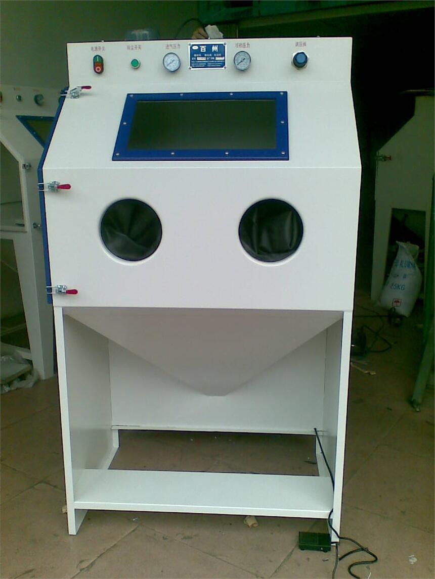 ·本机为普压箱式干喷砂机,采用手动操作控制方式,适合于小批量生产(按照以上规格产品计算,工时10小时,材质为铁件,表面处理要求为除锈,清理等级Sa2.5级以上,六个外表面全部处理,产量大概在300~500件左右);产量的变化依据锈层的深浅、工人操作的熟练性、上下工件的速度与所选用的砂料的好差。