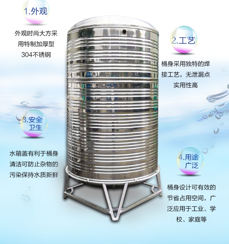 不锈钢锥底水箱:日兴不锈钢锥底冷水箱采用进口304不锈钢材质,电脑脉冲焊接设计制作工艺,使用寿命长,不生锈,不长青苔,不漏水等特性。