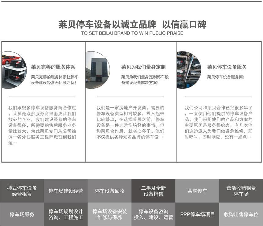 四川莱贝停车设备有限公司致力于贵州贞丰立体车库租赁、立体停车场装修效果、莱贝立体车库租赁、机械停车设备销售、机械式立体车库设备经营租赁、立体停车场建设、停车场经营管理、停车场规划设计、停车场施工建设、共享停车、盘活停车场、收购停车场、租赁停车场、收购停车位、出售停车位、停车资产管理及互联网停车软件开发车主服务等领域。我们为机场、车站、商场、大学、住宅、酒店、P+R停车等各种停车类型,从一个停车场一个区域到一个城市提供的停车位经营解决方案。公司严格按照ISO9001:2015质量管理体系、ISO14001:2015环境管理体系、ISO45001:2018职业健康安全管理体系要求,优化组织架构,规范内控体系,明确部门分工,积极开拓市场。业务特色鲜明,在市场营销、风险控制、业务创新、人力资源管理等方面均衡发展,形成覆盖全国的业务网络,建立了科学的管理模式。公司与多家机构、设备制造商、服务团队、停车管理等多家企业形成战略合作关系,抓住历史机遇,创造奇迹,在尽可能短的时间内,做大做强做牌。通过持续改进,不断设计并优化停车场方案,为客户提供多元化的立体停车场经营以及技术支持服务,致力于成为国内更具创新力的立体停车场经营提供商。为了响应快速发展的停车需求和引入社会资源优化停车产业结构的号召,莱贝停车设备配合政策,改善车主停车体验,解决城市停车难题,将未来停车产业推向新的领域。公司充分利用人才、技术和设备优势,租赁一系列适合国情的、高的产品。主要有:贵州贞丰立体车库租赁、立体停车场装修效果、莱贝立体车库租赁、简易升降式、升降横移升降式等。该产品具有占地面积少、空间利用率高、安装方便、能耗低、噪音小等特点,适用于各种场地和建设要求。公司为客户提供立体车库规划计划、施工设计、安装调试、运营培训、技术支持售后、机械停车设备销售、租赁、回收等多项服务,直至客户满意。