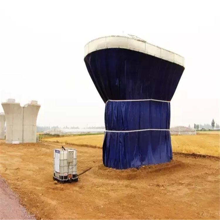 制梁场箱梁喷淋养护设备生产适用于梁场及施工现场浇筑完成后喷淋养护工作,降低人工劳动力,一人可遥控多台降低用水消耗。“墩身混凝土喷淋养护”工艺原理是通过蓄水箱、高扬程水泵、时间继电器、输水管、喷淋管组成喷淋系统(如图1),蓄水箱的蓄水量能够保证连续喷淋作业条件后,设定时间继电器的时间间隔和持续时间并开动喷淋系统电源,喷淋系统进入工作状态。继电器到达制定的喷淋间隔时间后自动接通水泵开关,高扬程水泵从蓄水箱内抽水送至输水管内,输水管连接环形喷淋管道,此时喷淋管喷头对墩顶包裹的养护土进行喷淋洒水。通过湿润的土工布经重力自流将水幕均匀的传递到需养护的墩身混凝土面上,喷水时间达到预定的时间后,时间继电器关闭水泵开关停止。