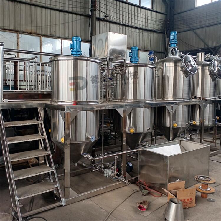 将原油泵入炼油罐进行脱胶和中和。当油和皂脚清晰分离时,迅速下沉,停止搅拌,静止,然后将上层油吸入洗涤槽。小型精炼油设备,皂脚由底部排空管放至皂脚桶,当皂脚含较多油时,停止放皂脚,皂脚由泵打入皂脚罐。炼油罐中剩余的油混入下一罐继续。小型精制油设备,转移至精制油罐的清洗油被水洗,到脱色罐进行吸附脱色。脱色油用泵送到板框过滤器过滤,再转入抛光过滤机进一步过滤,经过冷却器冷却后进入脱色清油灌。脱色后的清油从清油罐通过换热罐吸入除臭罐进行除臭。除臭在3-5托的残余压力下进行。脱臭油放入换热罐后,下一罐脱色清油通过换热罐吸入脱臭罐进行下一次脱臭。小型精制油设备的热交换槽的脱臭油进行热交换后,用冷水蒸发制冷,用泵抽出并研磨过滤,装入成品油槽。