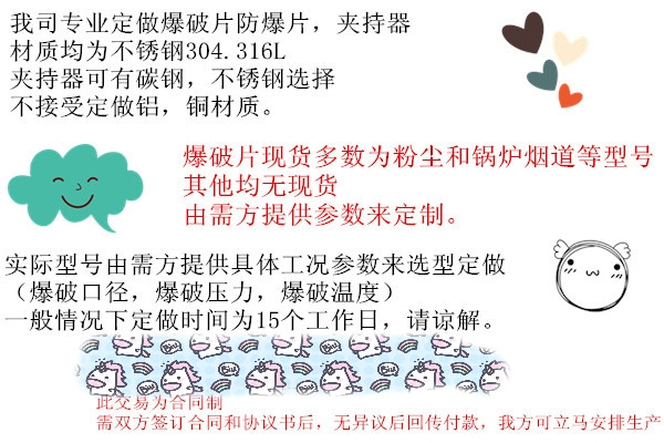 公司经营正拱普通组合型爆破片(LPZ)、正拱普通型爆破片(LP)、正拱普通带托架型爆破片(LPT)、正拱开缝型爆破片(LF)、正拱开缝带托架型爆破片(LFT)、圆形平板开缝型爆破片(PF)、圆形平板开缝带托架型爆破片(PFT)、方形平板开缝型爆破片(PFF)、方形平板开缝带托架型爆破片(PFFT)、反拱鳄齿型爆破片(YE)