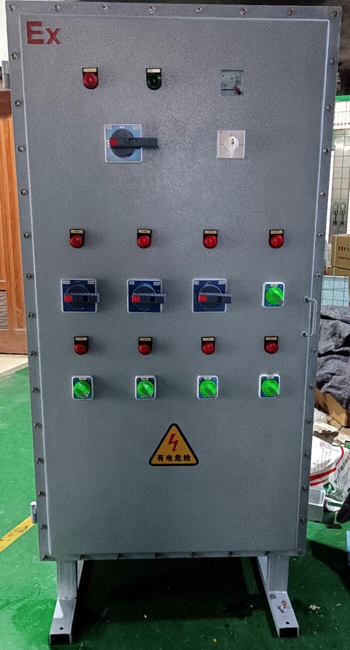 2:多种结构形式,箱内装高分段小型断路器或者塑壳开关,交流接触器,热继电器,变频器,中间继电器,时间继电器,变压器,软启动器等元件,表面加装防爆指示灯,防爆按钮,防爆开关,防爆电位器,防爆急停按钮等,内部有接线端子;