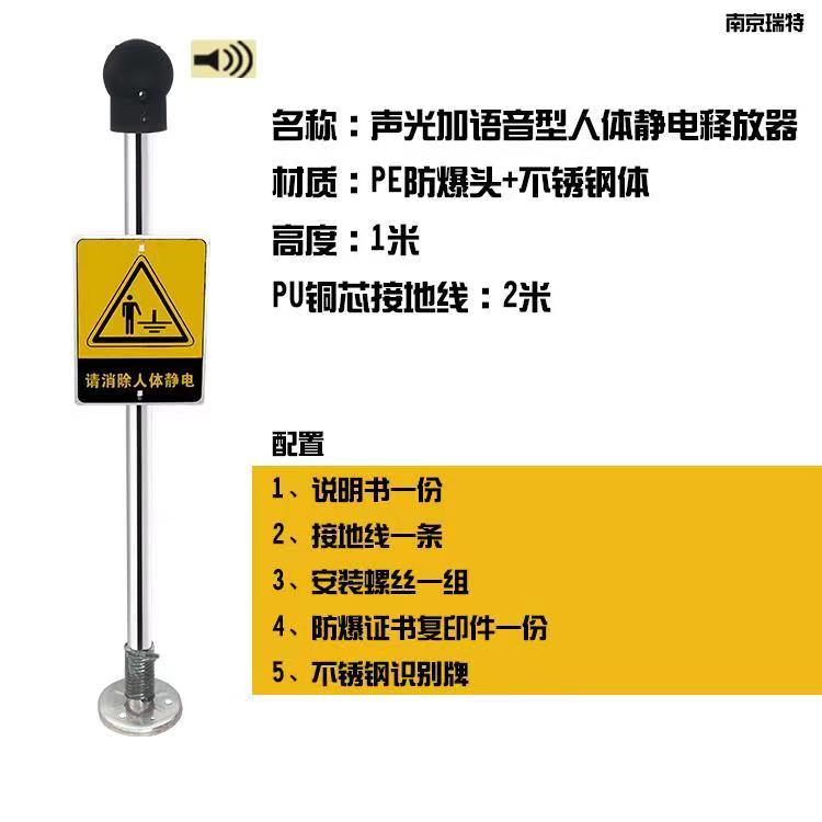 人体静电释放器经国家防爆电气产品质量监督检验中心(NCEX),完全符合下列标准: GB3836.1-2010爆炸性环境部分:防爆人体静电释放器设备通用要求 GB3836.4-2010爆炸性环境第4部分:由本质安全型“i”保护的设备 GB50074-2002《石油库设计规范》 SH3097-2000《石油化工静电接地设计规范》 防爆人体静电释放器的外观是由不锈钢管和静电亚导体球制成,静电亚导体是介于导体和非导体之间的材料,其表面电阻率大于106Ω小于109Ω。在电荷泄漏时,因为亚导体具有较高电阻率,其泄漏电流十分微弱,处于μA极,不会产生瞬间电击现象,避免因电火花可燃性气体,从而达到导电防爆的目的,采用静电亚导体的防爆人体静电释放器更适用于易燃易爆等危险防爆环境,如加油站、石油库等对静电特别敏感的场所。
