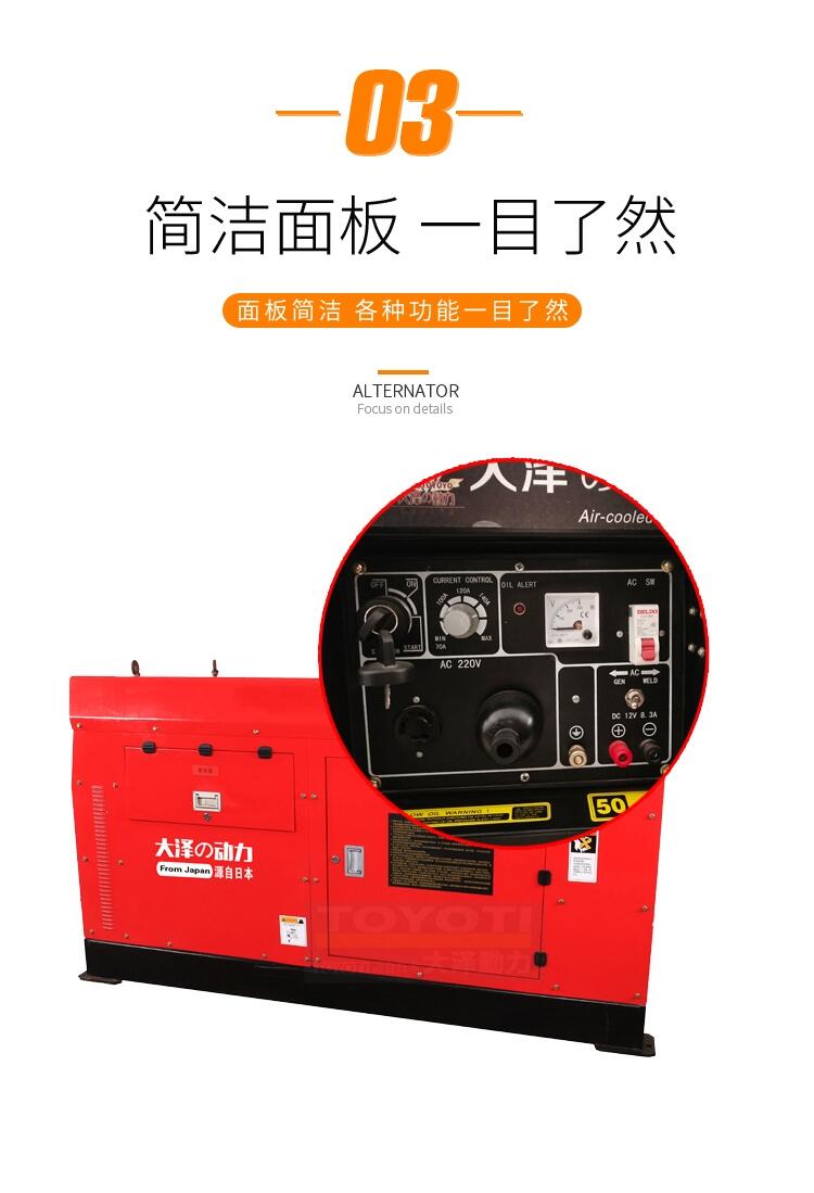 柴油电焊发电两用机组 *适用多种焊条可以根据机组的功率焊 0 - 8.0 毫米的焊条 ,大泽动力电焊工作更稳定、飞溅小,大泽发电焊机符合焊接标准 。