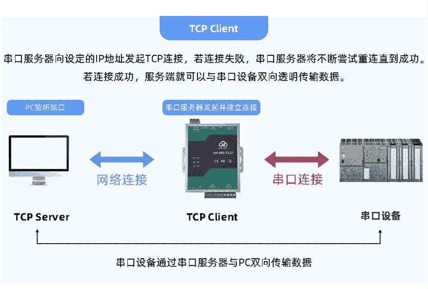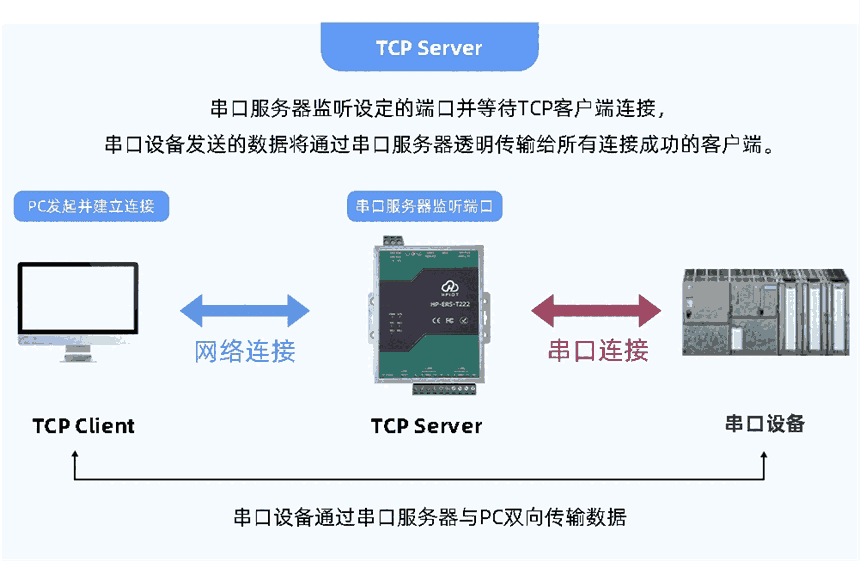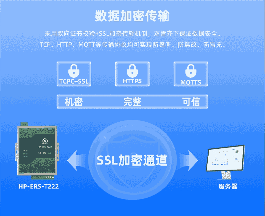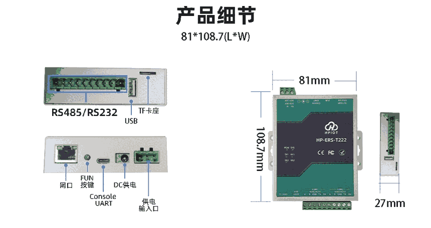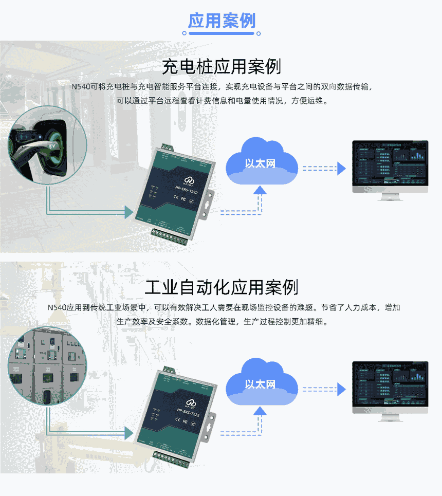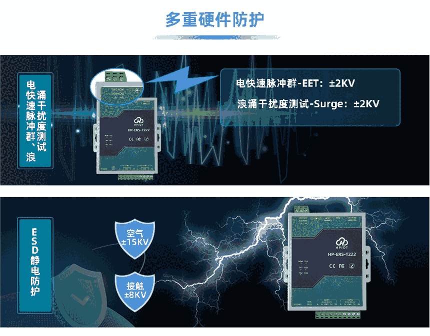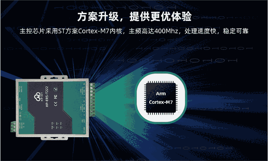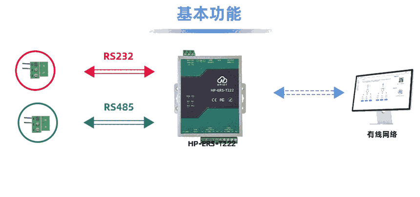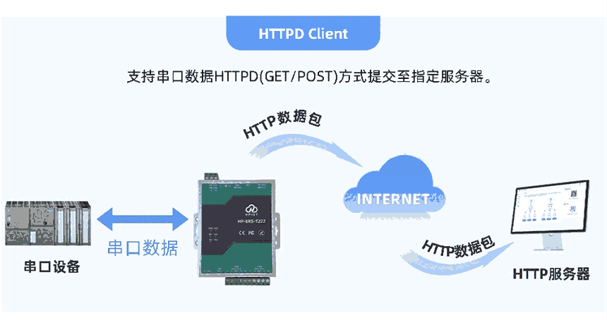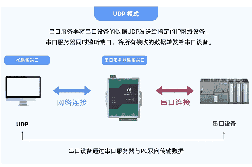 HP-RES-T222双串口服务器用于实现串口到以太网口的数据的双向透明传输。用户无需关心具体细节,服务器内部完成协议转换。串口一侧实现串口数据的透明传输,以太网口一侧则是TCP/IP数据包,通过简单设置即可**工作细节,四个串口相互独立。可以通过服务器内部的网页进行,也可以通过设置软件进行设置,一次设置永久保存。HP-RES-T222是一款双串口服务器,采用Cortex-M7方案,主频高达400MHz,性能更强,传输速度更快,可靠性更高。搭载深度优化的TCP/IP协议栈。双重看门狗和多种保活机制助力设备稳定运行。支持TCP Client、TCP Server、UDP Client、UDP Server、Httpd Client五种工作模式,简单配置即可实现数据透传功能。