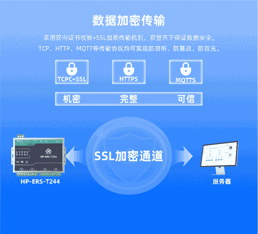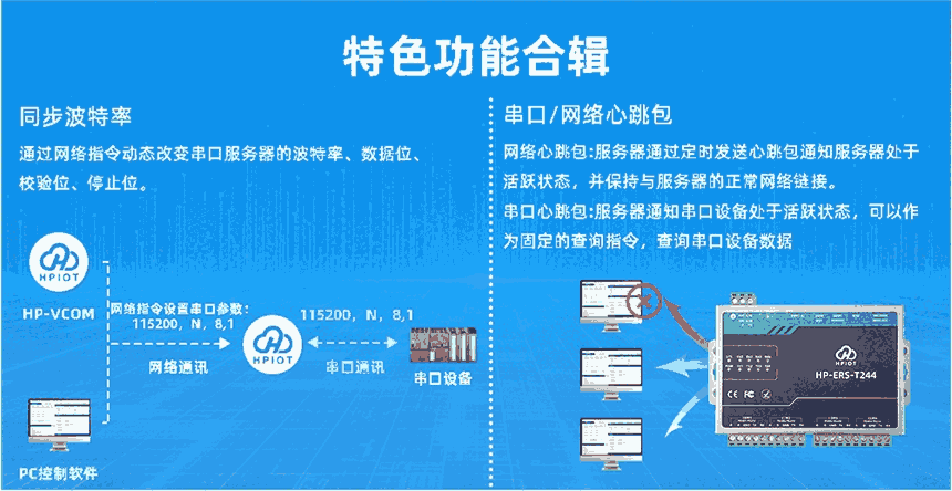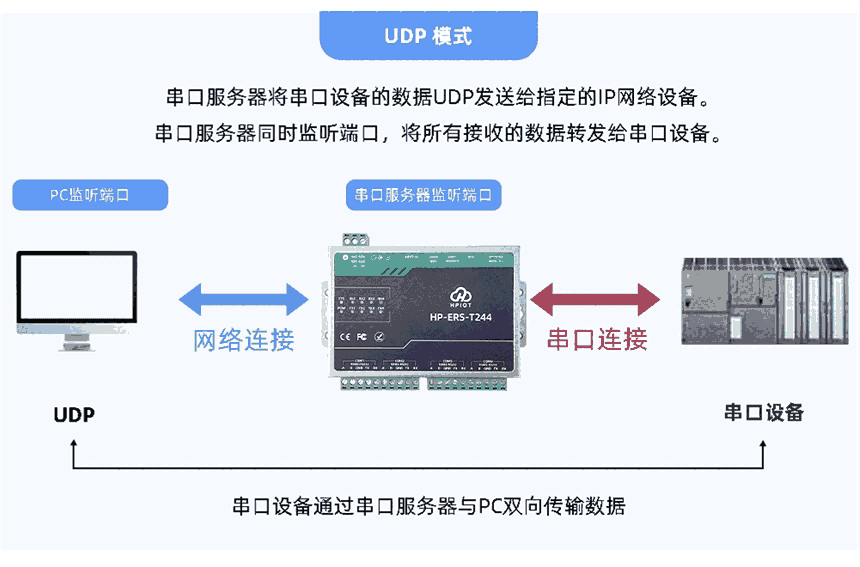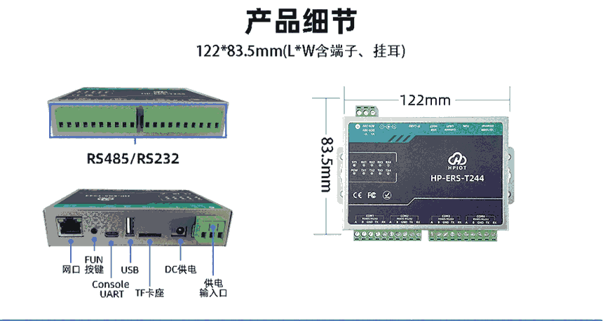 HP-ERS-T244四串口服务器用于实现串口到以太网口的数据的双向透明传输。用户无需关心具体细节,服务器内部完成协议转换。串口一侧实现串口数据的透明传输,以太网口一侧则是TCP/IP数据包,通过简单设置即可**工作细节,四个串口相互独立。可以通过服务器内部的网页进行,也可以通过设置软件进行设置,一次设置永久保存。采用Cortex-M7方案,主频高达400MHz,性能更强,传输速度更快,可靠性更高。搭载深度优化的TCP/IP协议栈。双重看门狗和多种保活机制助力设备稳定运行。支持TCP Client、TCP Server、UDP Client、UDP Server、Httpd Client五种工作模式,简单配置即可实现数据透传功能。