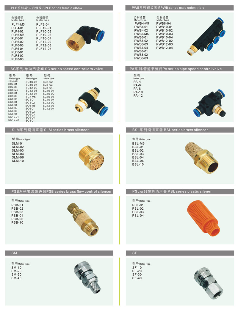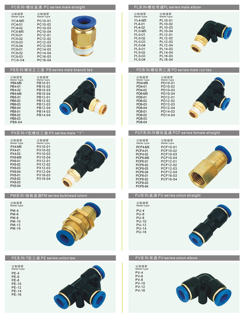 塑料快插接头、快拧接头、卡套接头宝塔接头、消声器、堵头、多款补芯、球阀、球阀、C式快速接头、铜接头供选。