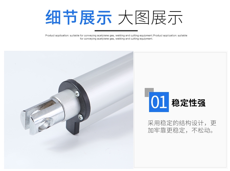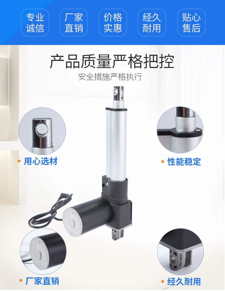 具有节能环保,性能可靠,动作灵敏,运行平稳,推拉力相同,环境适应性好等特点。设计新颖精致、体积小、精度高、完全同步、自锁性能好、卫生,电机直接驱动,不需要管道的气源、油路,现已大量用于生产线、汽车、透气窗开启、军工、舞台、纺织、污水处理等各个行业设备上.