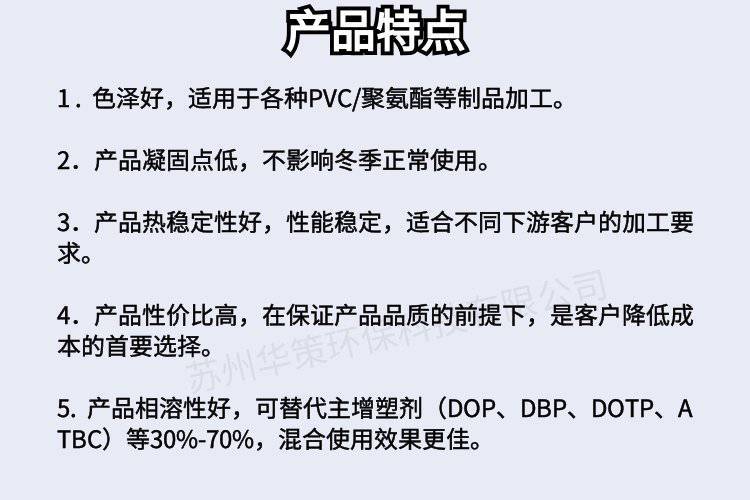 1、优良的增塑效果、增加制品柔韧度、耐老化性能。