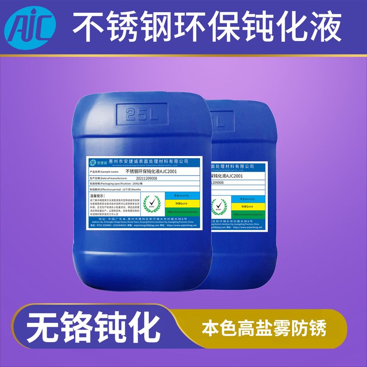 安捷诚不锈钢环保钝化液(AJC-2001)适合所有SUS200和SUS300系列不锈钢材料钝化 ,材料通用性强、便于使用。可不锈钢表面形成均匀的钝化保护膜,并提高不锈钢工件抗盐雾性能。中性盐雾性能提高 10-30 倍。