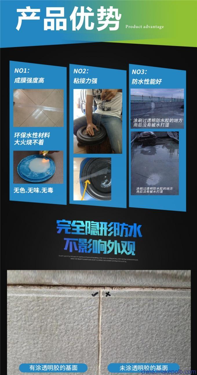 产品概述 外墙透明防水胶,适用高分子聚合物合成乳液,加入成膜、塑钢等助剂合成的乳白色液体。液体干固后形成透明膜层的防水涂膜,涂膜具有高度柔韧度、耐磨性、透气性和优异的耐候、耐高温性。产品直接用于墙面瓷砖表面、石材表面、外墙基面等。产品不脱落、不起皮、不粉化、不氧化、不与酸碱反应等。 产品特点