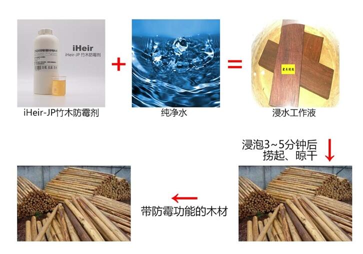 E.表面涂喷光油(油漆)的竹、木、藤、草及其制品,经以上处理后,在光油里添加iHeir-YQ 油漆防霉剂,效果更为显著。