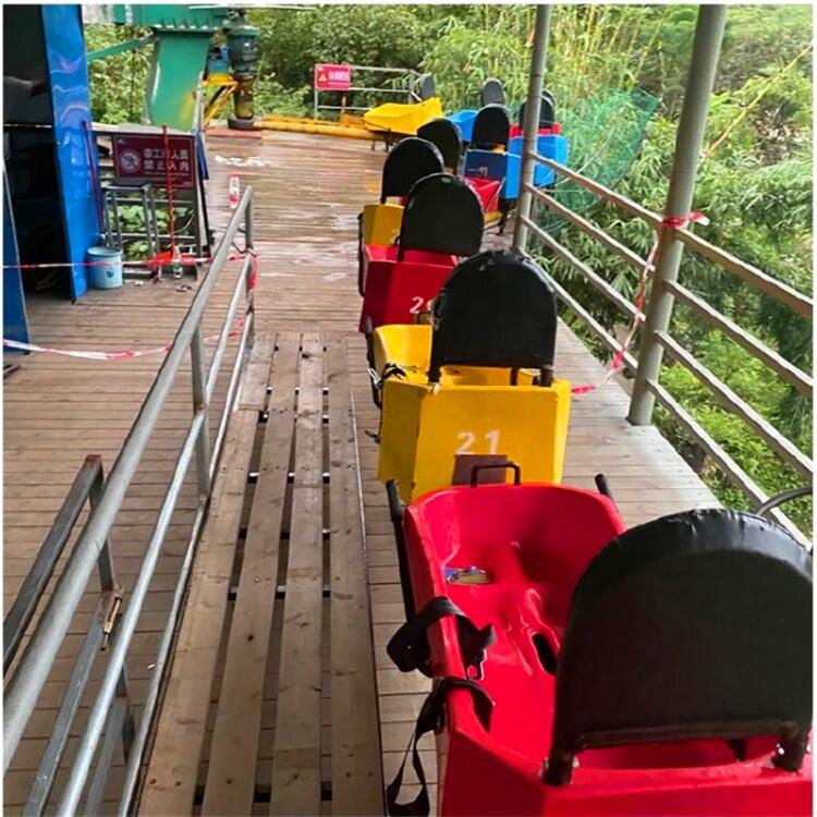滑车:具有刹车功能 可供乘坐者乘坐、沿 滑 道 自 上 而 下 进 行 无 动 力 滑 行 的 小 车 。 滑 车 为 双 人 滑 车 ; 滑 车 的 刹 车 手 柄 可 布 置 在 前部中央或两边滑道坡度: 单管式滑道≤4% 滑道任意区段最 坡度:4% 提升系统:滑车挂结在设置在索道运行工具上的挂结装置上通过拖牵索由拖索道提升上。