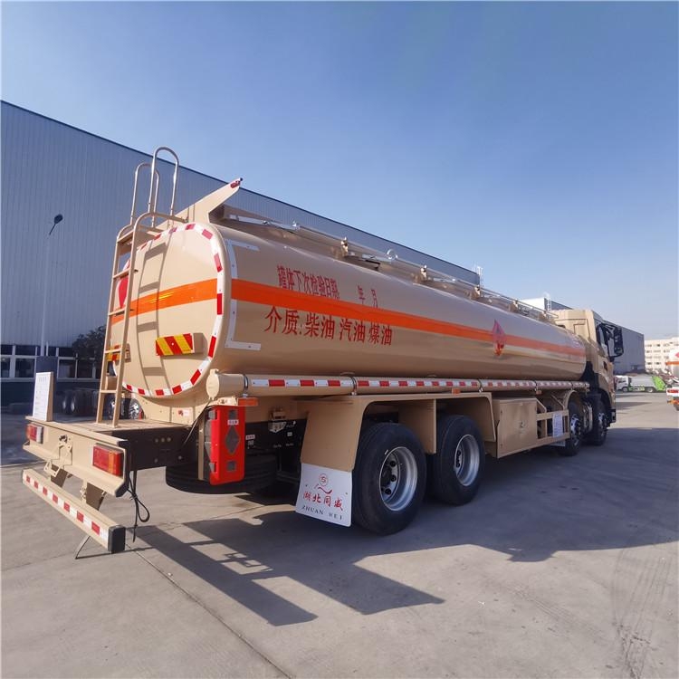 上装配置: 严格按照公告尺寸制作罐体容积30.5立方,实际有效容积30.5方,罐体材质:国标5182铝合金材质,双仓带欧标全套:(两个欧标罐口、两个防溢流探杆、静电插座、油气回收、两个下装口、两个海底阀)安装副驾驶室一侧,罐体采用涨型封头6mm,罐体6mm,带山东80/80专用油泵,双仓带泵进泵出3寸管道3寸出口安装副驾驶一侧,后保险杠为可翻转,折叠护栏和附件均采用铝合金材质,两根罐体等长输油管、两个灭火器、一个防火帽、安全告示铝牌、全车欧式锁、牌照灯,其余标配。油漆:铝合金本色、贴反光条、反光带、安全告示、贴 “易燃” 标。