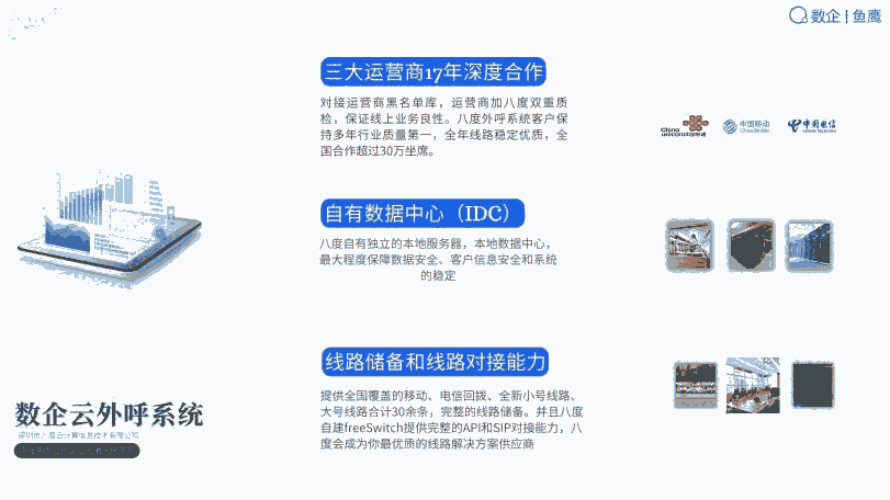 产品/服务介绍:数企鱼鹰云呼叫中心系统是深圳市八度云计算信息技术有限公司推出的一款基于云端的SAAS系统,仅需一台电脑/手机即可实现完美通话呼叫中心服务,并提供一站式云呼叫中心、号码和电话线路的即买即开即用的服务。